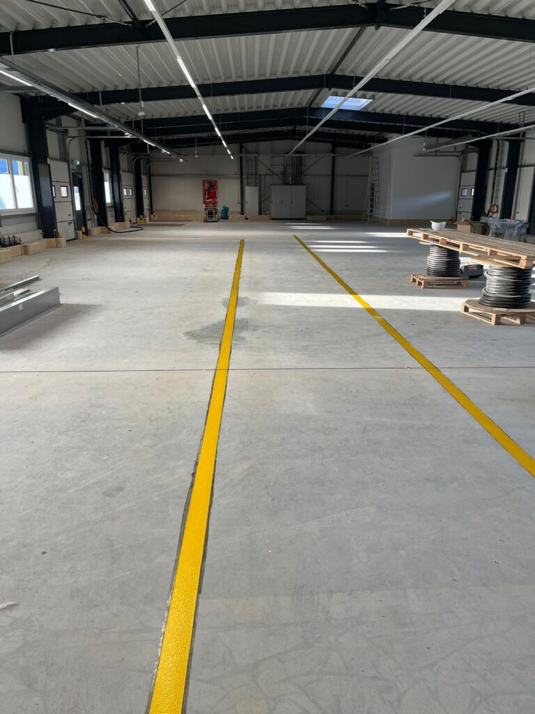 Außen wurden LKW Leitlinien und Fußgängerüberwege markiert. Im Innenbereich wurden Palettenstellplätze, Laufwege und Sperrflächen gekennzeichnet.